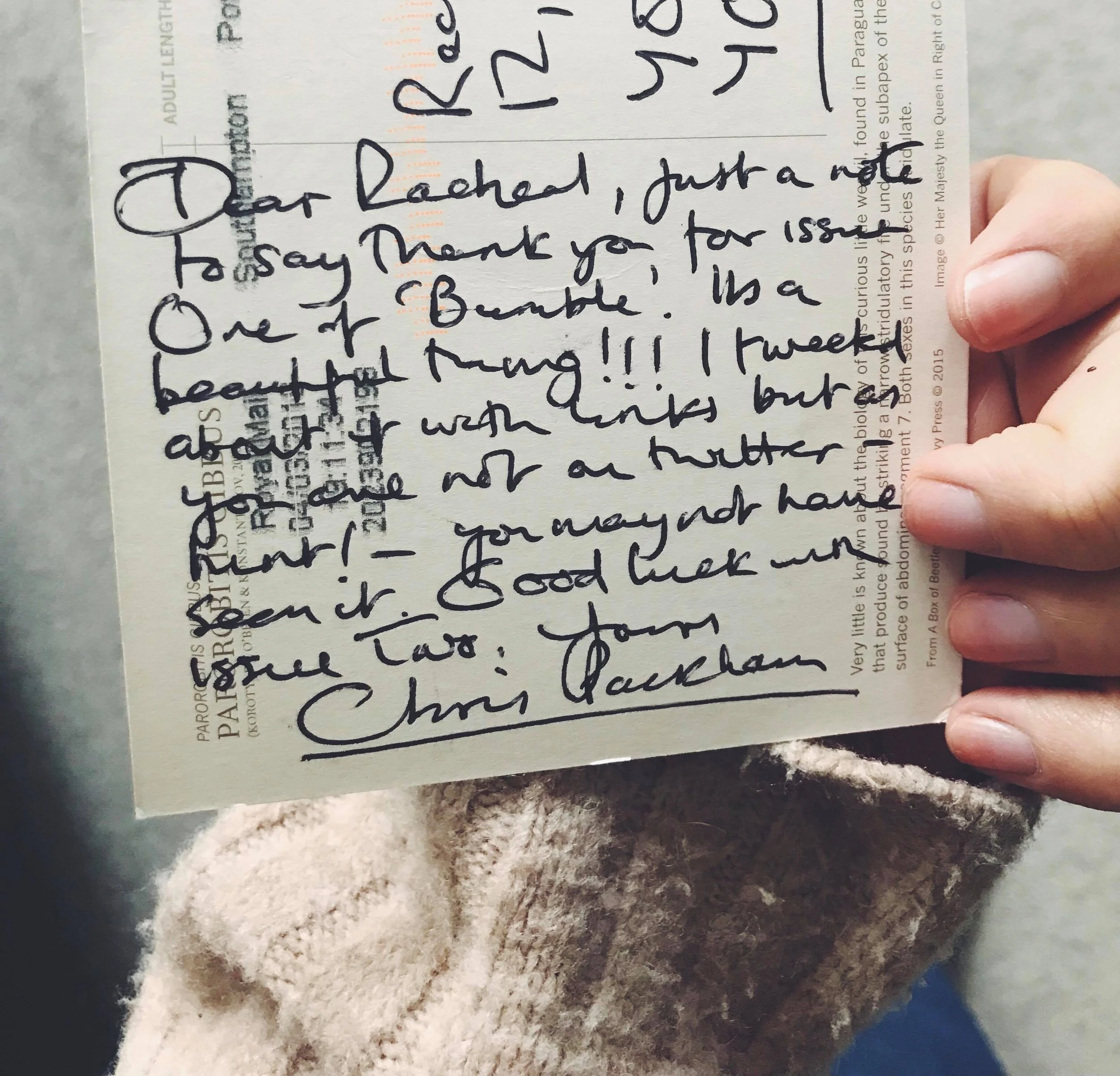 I would say the highlight of running this magazine is having a platform to speak about issues really close to my heart and giving others the platform to do the same. I love writing about the less recognized species such as spiders and pigeons and trying to shed a better light on them. We have also received a postcard from Chris Packham who described Bumble as a ‘thing of beauty’, as well as the man himself, David Attenborough, who, in a handwritten letter, said it was ‘one to treasure’! These achievements mean the world to us and truly illustrate how far a grass-roots publication such as ours can go.